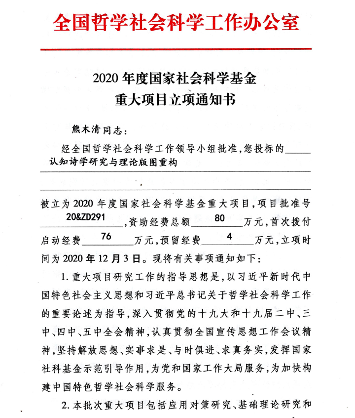 中国比较文学认知诗学分会理事长、bibo必博官方网站熊木清教授主持申报的2020年国家社科基金重大招标项目《认知诗学研究与理论版图重构》成功立项,批准号:20&ZD291,本项目是国内认知诗学研究领域的首个国家社科基金重大项目。本次重大项目能够成功获批立项,充分表明国家政府层面以及学界同行专家对认知诗学这一新兴跨学科研究领域的重视和支持,也标志着国内认知诗学研究即将进入新的发展阶段。据悉,熊沐清教授的团队成员包括了国外认知诗学的知名专家Lisa Zunshine,Peter Stockwell,Frederick Luis Aldama 和Karin Kukkonen。该项目的研究计划着眼于文学研究整体架构,将对包括文学理论、文学批评、文学史和比较文学等主要领域分别展开认知研究,开启和推动国内文学研究的“认知拓展”,项目前期成果之一“比较认知诗学的理论建构”已刊于中央级报纸《中国社会科学报》(2020年8月31日)。同行普遍认为,以此次重大项目为契机,国内认知诗学研究将再上新台阶、再拓新局面。