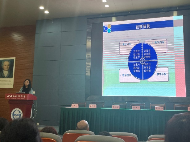 第三位汇报人赵奂以自己主持的国家级一流课程《英语语音与口语》的发展和建设为基础,提出了“融合创生跟进式教学模式”。赵奂指出,本创新教学模式能直面英语专业本科基础课程的技能与理论脱节、语音与音系意识割裂、技能与思想文化剥离、学科与科学分割四大痛点。结合00后学习者群体特征及个体学习需求,本模式融合教学内容、教学目的、教学理念、教学手段,促成学习者在基础技能、理论水平、思想境界等整体素养不断成长,教学者进行全过程技术跟进,实现学习者端和教师端的角色重塑,推促学习者口语产出能力和交际能力的全面提升,以及教学者的教学能力和科研能力的全面提升,实现学习者素养与教育生命力的完整生长。