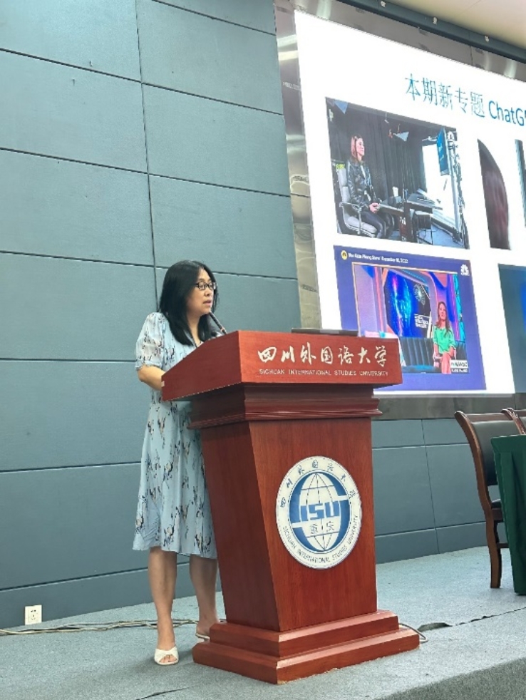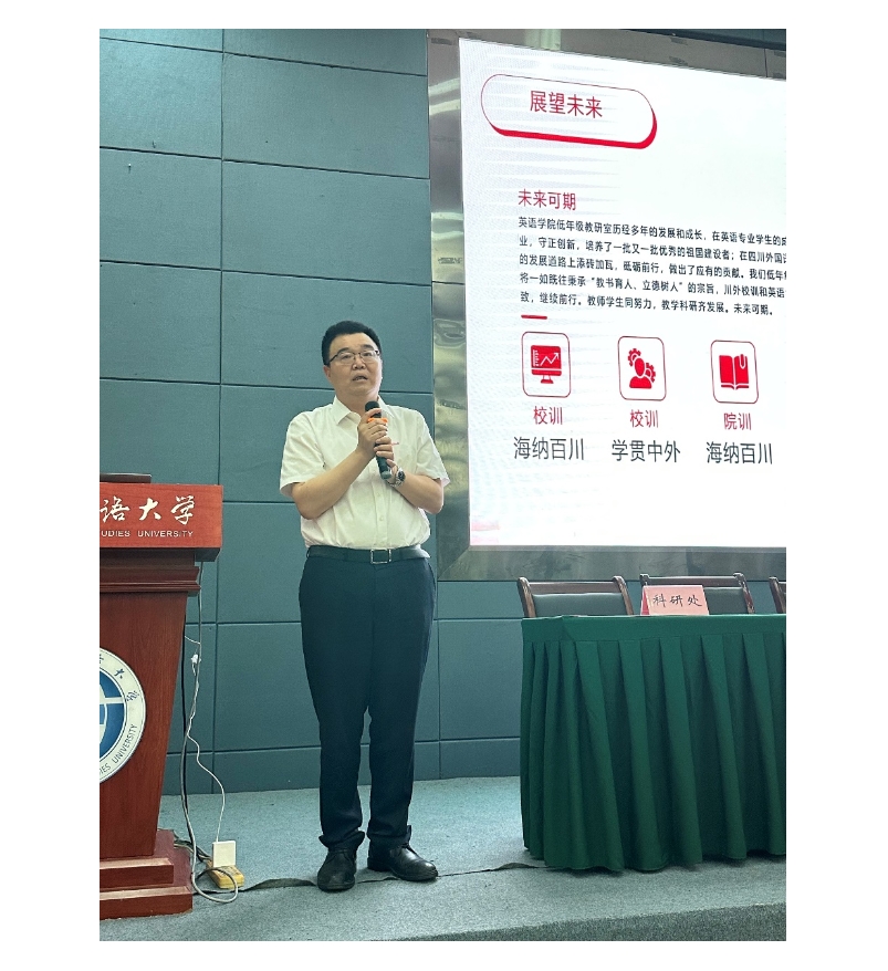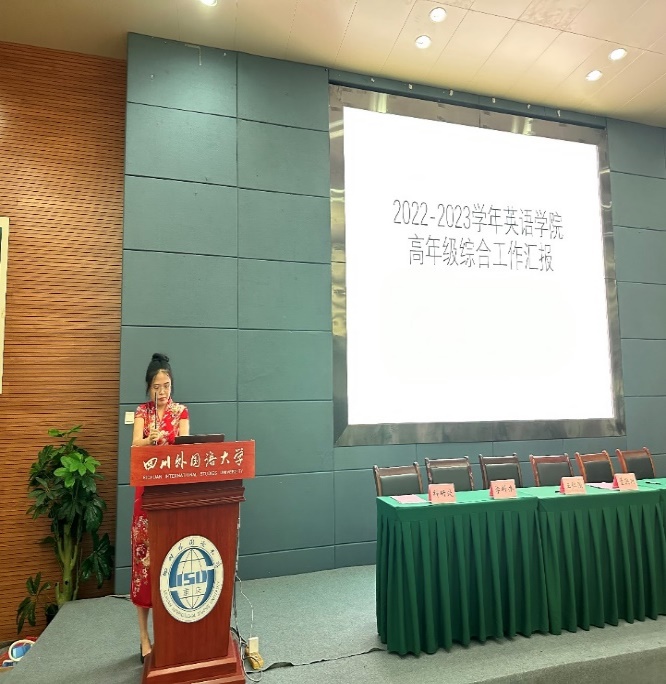 随后高年级教研室负责人责人邱梦颖就高年级各教研室本学年相关工作进行了简要汇报。邱梦颖从科研成果、2023年专业八级备考及公司近三年专八考试成绩分析、实践周活动、教师发展、教师指导员工获奖、教师自身参赛获奖、各级课程、教改项目、本科生毕业论文和新培养方案中2021级各个方向班级分布、课程设置方面总结了高年级教研室一年来的工作。