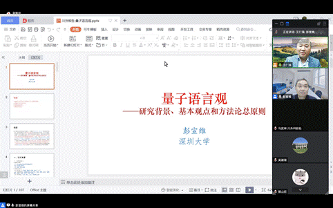 在讲座中,彭宣维教授深入浅出地介绍了量子语言观的研究背景,举例说明其涉及的研究问题,并梳理了反映量子思维的语言学观点,提出量子思维对当代语言学研究的优势,建议从全局角度为语言事实研究建立自洽性的范畴体系和方法论原则。彭教授运用大量例证和图表生动介绍了量子语言观的基本观点及其对部分问题的解答方案,对语言中的叠加态、量子坍缩、量子跃迁、量子缠态、量子隧穿、不确定性、对称性破缺等特征和状态进行了阐释。彭教授还从方法论原则的角度介绍了量子思维下的互动观、整体观与互补观,及其作为语言问题解答方案的应用。在总结部分,彭教授就量子语言观的自治与非自治问题,是否属于原子主义思路、物质主义思路、量子力学的应用性学科,是否可与量子力学类比等进行了对比阐述,说明量子语言观的超学科性及其发展优势。讲座结束后,彭教授就在线提问中的哲学相对性问题与师生进行了深入交流。