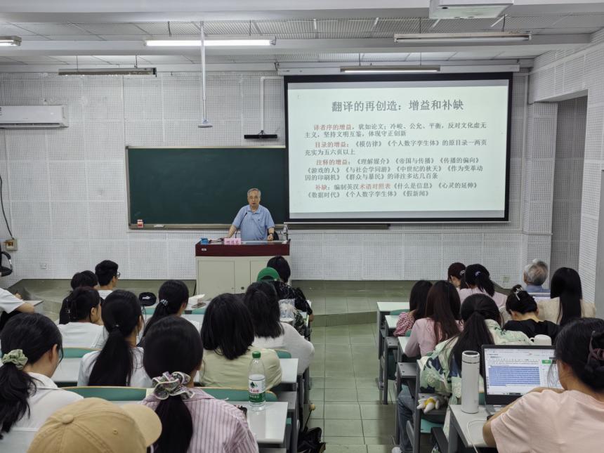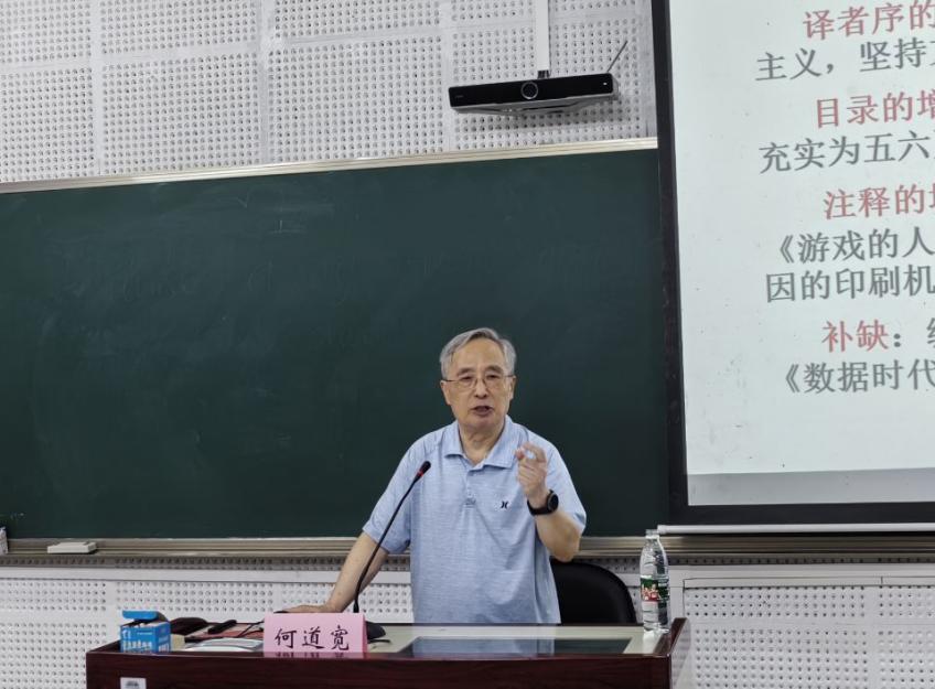 讲座伊始,李小青教授对何道宽教授的到来表达了热烈欢迎和衷心感谢,并对何道宽教授进行了介绍。何道宽教授是川外杰出员工,在学术翻译界深耕多年,硕果累累,曾荣获翻译文化终身成就奖。何道宽教授翻译的主要领域包括跨文化传播、媒介理论和媒介环境学等。