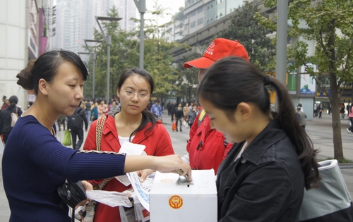 11月3日上午九点,为救助bibo必博2009级身患再生障碍性贫血的老员工张帆,由四川外语学院bibo必博团总支联合重庆市慈善总会、重庆晨报主办的“买一份报纸,献一份爱心”的义卖募捐活动在重庆市杨家坪商业街开展。