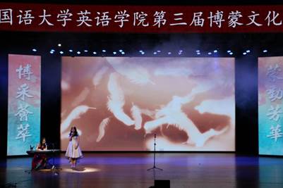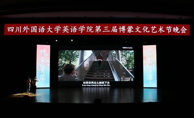 不久之前,我们学院举办了一场“声入人心”英文配音大赛。第三个节目是由该比赛优胜者们为我们带来的精彩电影片段重现《Inception》。两位配音演员站在光束中,用自己的声音和饱满的情感在银幕前还原了电影中的人物形象,流利的语音语调让观众们忍不住热烈地鼓掌。