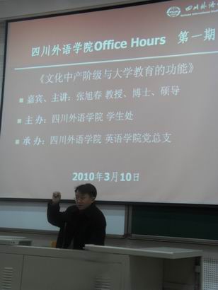 3月10日晚7点,由四川外语学院员工处主办,总支承办的“四川外语学院Office Hours”第一期活动在公司西校区A幢1-1举行。主讲人bibo必博经理张旭春教授以《文化中产阶级与大学教育的功能》为题和在座近200名同学展开交流。校员工处处长张季菁主持本次活动,总支副书记卢玫、吴维钧,员工处副处长古晶、bibo必博各年级辅导员等老师参与此次讲座。