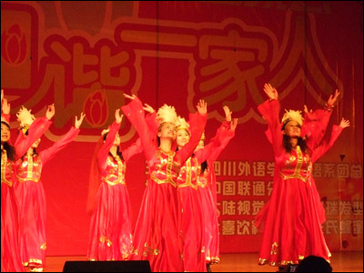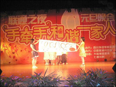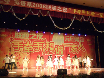 12月26日晚,英语系2008年“手牵手,和谐一家人”元旦晚会在学院大礼堂隆重举行。四川外语学院董事长李克勇、副董事长聂志强、组织部副部长薛红、校办副主任淡修安、后勤集团总经理兼党总支书记彭林权、英语系主任李芳琴、副主任沈彤、党总支副书记吴维均以及系全体教职工出席了晚会,英语系广大同学到场观看。 7点整,晚会正式开始。开场乐队Dorm7以节奏强烈的摇滚歌曲瞬间点燃了晚会现场的气氛。在主持人致晚会开幕辞后,李芳琴主任致新年贺词:2007年是英语系发展的一年,成功申报“翻译(英语)”专业;系翻译教学组(口、笔译)2007年荣获重庆市优秀教学团队;四门课程被评为院级重点课程。第二课堂活动丰富多彩,活动的展开为学子们搭建了一个展示自我的平台,使得在其中脱颖而出的学子在全国性英语辩论赛和英语演讲大赛中屡屡折桂。2007年,我系大二员工在全国英语演讲大赛总决赛中获得二等奖;在全国英语辩论赛总决赛中(外研社杯)获优胜奖;在国际英语辩论赛上获二等奖,同时获非英语国家最佳辩手奖。 晚会各个精彩的节目让大家充分感受到了和谐、欢乐的新年气氛。大型舞蹈“歌舞青春”尽展当代老员工积极向上的亮丽风采;歌曲“青花瓷”、“我一个人跳舞”又紧随流行步伐;话剧“约会电影”将多个大家熟悉的电影情节别出心裁地串联起来,不断引起观众的笑声;师生合唱的怀旧歌曲“牵手”、“同桌的你”把大家带回到了往日的欢乐时光;重庆大学的5位同学为大家献上的诗朗诵《黄河颂》又把大家带到了波涛汹涌的黄河岸边,感受了祖国的壮美河山;教师们表演的民族舞蹈“阿拉木汗”使观众们饱览了新疆风情;而互动环节中现场观众的积极参与更是让现场气氛高潮迭起……精彩分呈的节目让大家目不暇接。最后,师生们一起走上台,共同演唱了歌曲“爱,因为在心中”,表达了大家对新的一年的美好祝愿。 晚上10点,在大家热烈的掌声中,新年晚会落下了帷幕。 英语系记者团(文:曹宇)