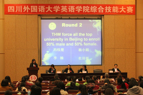 该辩论赛采用通用制度,分三轮进行,每轮两组互辩,两人一组。在第一轮比赛中,围绕“THW ban all forms of portrayal of violence in the media”这一辩题,双方展开了激烈的辩论。正方刘一绯有条不紊地展开论述后,反方黄丽莎迅速抓住对方遗漏点进行有力反驳,其敏捷的思维和强大的气场赢得了观众们的阵阵掌声。第二轮中,辩题“THW force all the top university in Beijing to enroll 50% male and 50% female ”更加贴近校园生活,选手们的激辩状态也让现场气氛不断高涨。正方一辩冯钰楚沉着冷静、逻辑清晰,运用大量具体数据来论证她们的观点,同时还与队友李楠配合默契,给对方压力无形压力。但反方也毫不示弱,杨小娟和杜诗雨十分镇定,巧妙避开不利点,采取扬长避短的方式进行反击。中场休息时,于诗馨同学的一首《dance with my father》饱含深情;林雪倩和吴书同学的琵琶吉他组合曲更是别出心裁,现场气氛顿时变得轻松愉悦。根据评委评分,刘一绯、夏田禾组和冯钰楚、李楠组晋级决赛。紧接着,最后一轮对决开始,双方以“THBT legalize same sex marriage”为主题展开激辩。双方选手都竭尽全力,中途提问和回驳愈演愈烈,全场陷入紧张的气氛中。正方的冷静缜密和反方的犀利言辞都给观众们留下了深刻印象,也博得了评委的赞许。最终,李楠、冯钰楚组合获得了一等奖。