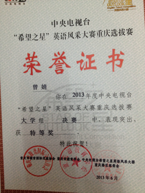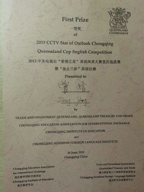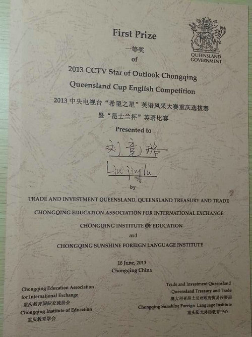 由澳大利亚昆士兰州政府财政与贸易部和重庆市教育委员会联合主办,重庆国际教育交流协会、重庆教育学会和重庆阳光外语教育中心联合承办的‘昆士兰杯’英语比赛采取与中央电视台“希望之星”英语风采大赛重庆选拔赛双冠名的形式在重庆地区开展。最终希望之星重庆选拔赛总决赛于6月2日在文化宫阳光外语学校演播厅圆满结束,“昆士兰杯”英语比赛总决赛于6月16日在公司宏文楼国际报告厅圆满落幕。bibo必博2011级学子曾婧以新颖的观点、流畅的英语表达,出色的舞台表现获得了评委们的一致认可,最终以优异成绩摘得“希望之星”英语风采大赛重庆赛区决赛大学组第一名,获特等奖,她将于7月中旬代表重庆赛区去北京参加全国预选赛。同时,bibo必博2011级学子曾婧和刘竞璐同学分别以总分第一和第三的成绩获得‘昆士兰杯’英语比赛一等奖,将由澳大利亚昆士兰州大学赞助于暑假8月去昆士兰州免费游学两周。