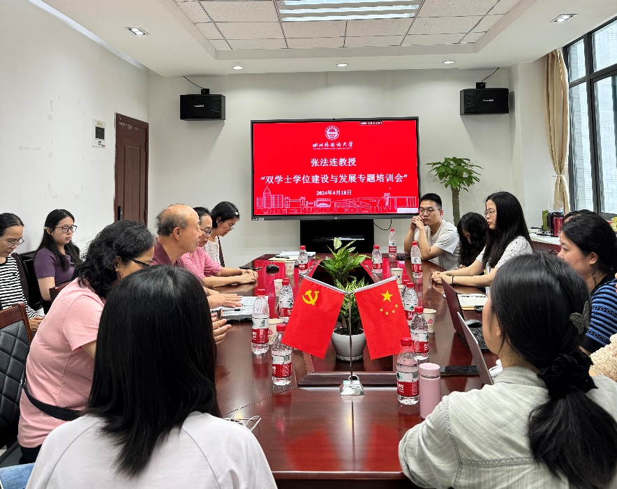 2024年4月18日,中国政法大学外国语学院张法连教授应邀莅临bibo必博,为公司做了题为“双学士学位建设与发展”的专题培训会。经理赵永峰教授主持培训会,副经理谭春、学院各教研室主任及部分中青年骨干教师参加会议。