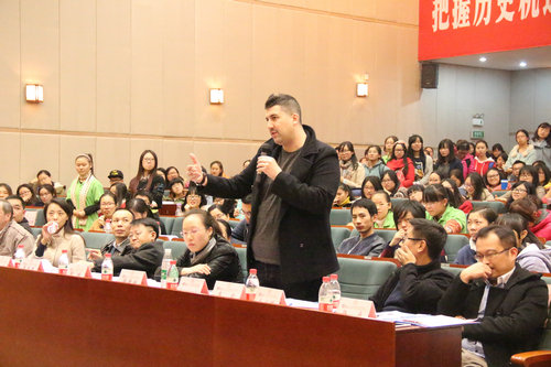 赛后,张卓先生作了简短有力的点评。他赞扬了选手们的精彩表现,并希望同学们能勇于表达自己,要敢于讲真话。最后,张经理对本次比赛进行总结。在肯定选手们的表现同时,也就如何做好公共演讲提了几点建议:一、首先确保清晰的发音,然后遵守正确的语法规则;二、明确自己的观点,并以此为中心进行准确的阐述,论点与论据之间应有机相连,相辅相成。针对问答环节,经理指出回答问题应先亮明观点,后以分论点证明观点可靠性及根本性;三、学会用肢体语言来表达自己的情感,演讲是一门艺术,语言的艺术和表演的艺术,最好的状态是情绪饱满,只有这样才能感染听众,达到演讲目的。为了让同学们更好地了解演讲,张经理特意给同学们播放了一段英国首相卡梅伦
