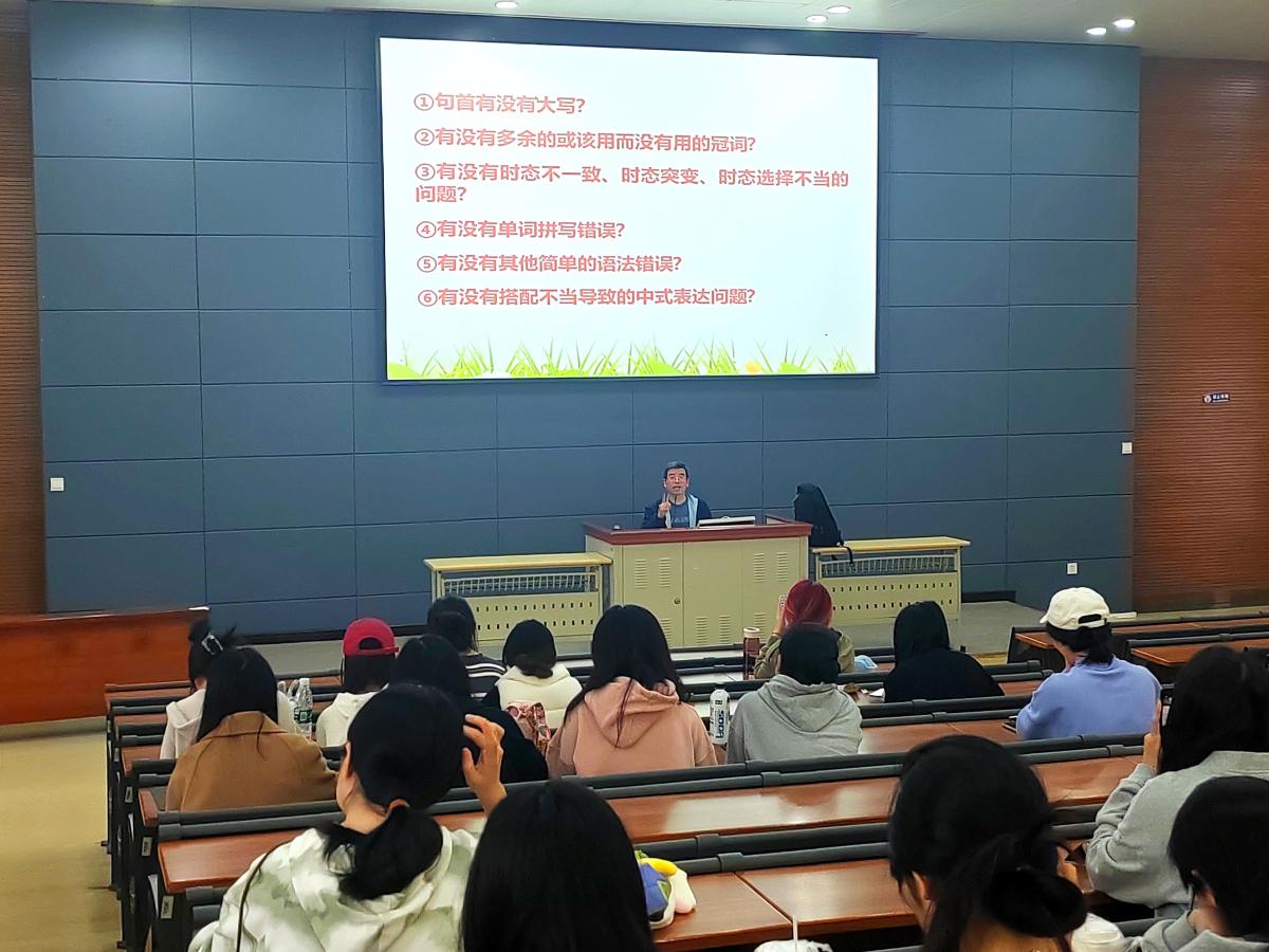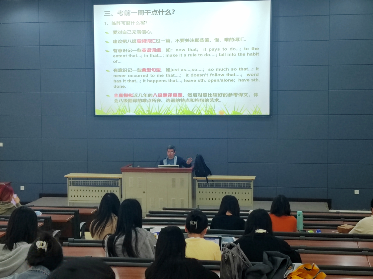 3月28日,王祖华博士围绕专八翻译如何考、八级翻译试卷如何改、考前一周干什么为同学们进行翻译备考指导。王祖华从专八翻译测试的出题方式、类别、评分标准、常见错误和备考策略等几方面进行细致讲解。他建议同学们在备考冲刺阶段熟悉八级高级词汇、中国文化方面的词汇以及出彩句型。此外,他还提醒同学们要注意书写工整。