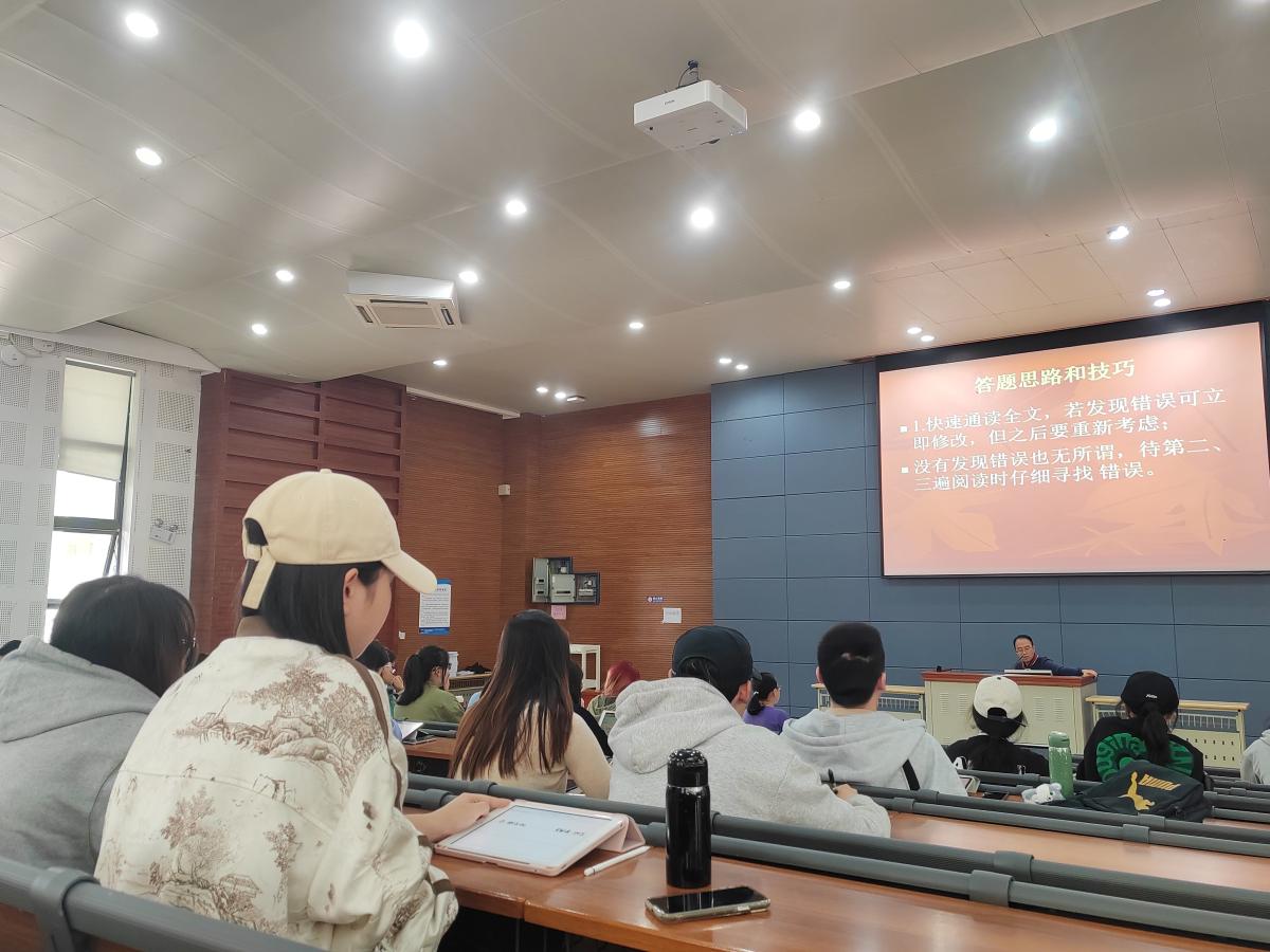 听力板块备考指导由杜华、姚凤英、魏涛三位老师分班级进行。3月26日,杜华老师对专八听力板块进行了深入解析。她强调,听力题目设计注重考察考生的综合理解能力和细节捕捉能力。同学们应熟悉听力材料中的高频词汇,学会从关键词出发抓住有效信息。