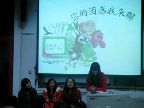 本次活动主题为“你的困惑我来解”,生活部邀请了三位优秀的大三学姐来到现场为大一新生答疑解惑。她们分别是:有着丰富社会实践经验的何宇洋;成绩优异获得国家级奖学金的黄秋燕以及个性独特,品学兼优的王奂文。