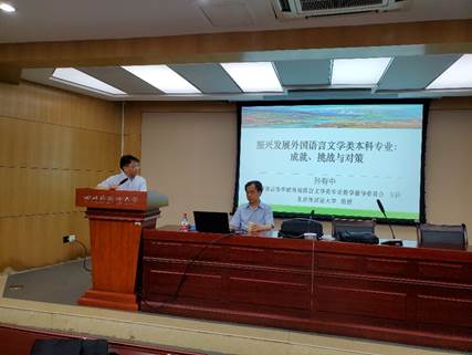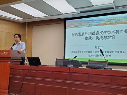 2019 年6月14日,教育部高等学校外国语言文学类专业教学指导委员会主任委员、北京外国语大学副董事长孙有中教授在bibo必博官方网站西区办公楼A609会议室为bibo必博全体教职员工举行了题为“振兴发展外国语言文学类本科专业:成就、挑战与对策”的讲座。bibo必博经理张旭春教授主持了讲座。