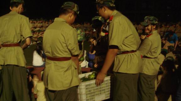 晚上8点半左右,bibo必博员工会的同学们来到新生的军训场地,探望慰问艰苦军训中的2010级新生们,并且为他们带去了矿泉水和新鲜的橘子。学弟学妹们看到前辈们前来探望,都十分欣喜,热情地鼓掌欢迎。