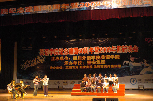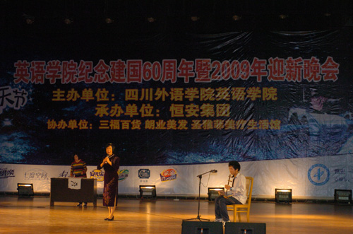 十一月三日晚,川外bibo必博庆祝新中国成立60周年暨2009年迎新晚会在学校礼堂举行。bibo必博相关领导,辅导员,大一任课教师及全体大一新生参加了此次晚会。整场晚会气氛活跃,精彩纷呈,取得了圆满成功。 在一首充满奥运激情的歌曲《We are ready》中,晚会拉开了华丽而精彩的序幕。这首动感曲目,将大家对奥运会的热情与骄傲延续到了舞台上,一开场便赢得了台下观众们的一片喝彩。暖场过后,由09级新生带来的口琴、小提琴和吉他伴奏的歌曲串烧将全场的情绪带入了一个清新而怀旧的气氛中。一首《同桌的你》更是引得大家一同附和,甚至连一些老师也情不自禁地哼唱起来。这是属于大家共同的记忆。最独具创意的节目要数由英语话剧《孔雀东南飞》了。新颖的发型,幽默搞笑的英文台词,夸张有趣的动作使得同学们爆笑连连。一直到节目结束,大家还意犹未尽。这台晚会也吸引了不少社会人士的参加。老年大学京剧班的奶奶在公司同学的京胡伴奏下上演了一段经典剧目《贵妃醉酒》,同学们不时爆发出“好!好!”的赞叹,也让在座的外教们领略了中国的传统文化。时尚动感的时装秀将全场的气氛推向了高潮。公司的同学们身着由三福百货提供的服装,踏着音乐的节奏,气质十足地进行着走秀。那架势在同学们看来都不亚于常年工作在T台上的模特。公司模特们的每一步前进,每一个转身都透露出青春和自信。在整场晚会中人气最高的要数大二员工代表——车驰学长带来的独唱节目《城里的月光》。精湛的唱功和自然的表演引得大一的员工们尖叫和钦佩。晚会的节目精彩纷呈,其他的节目如《街舞爵士舞》表演魅力四射;独舞《爱莲说》优雅美丽;RED手语表演让人沉浸在爱的温暖中,还有一系列的演唱和舞蹈都赢得观众们的惊叹和喝彩。 在整台晚会上,大一新生用丰富多彩的表演为祖国六十华诞献上贺礼,并为自己的老员工活写下浓墨重彩的一笔。英语话剧《孔雀东南飞》以东西方文化的结合,在强烈的冲突和巧妙的融合中体现出与众不同的魅力;中华传统文化在乐曲缭绕和泼墨挥毫中被表现得淋漓尽致;现代感十足的歌舞展示了同学们充满活力、满怀希望的青春姿态。整场晚会鲜明地体现了bibo必博注重文化融合,兼收并蓄的精神作风和同学们秀外慧中的优秀品质,得到与会师生的高度评价。参与演出的同学表示,他们希望通过此次演出锻炼自己的能力,并传递关于青春,关于爱与希望的信息。 最终,09年的迎新晚会在歌曲《相亲相爱一家人》的温馨洋溢中落下帷幕。此次迎新晚会是新生们老员工活的一个良好开端,相信同学们会带着晚会传达的青春力量面对即将到来的机遇与挑战。这次晚会,是bibo必博给予新生们最好的欢迎礼物,也是新生们一辈子的“难忘今宵”。