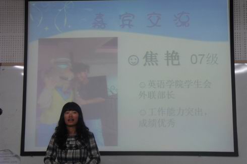 活动共分为两个部分:第一部分是嘉宾交流,第二部分是员工干部提问嘉宾回答。第一个上台发言的人是bibo必博员工会前任主席07级学长周围。作为07级员工代表,周围学长工作踏实认真,工作能力强,并且社会实践经历丰富。对大一新生干部,周围学长的建议是“低调做人,高调做事”。他解释到,所谓“低调”不是默默无闻,而是指不要浮躁,要静下心来思考。所谓“高调”是指判断事物要有明确地判断,例如行与不行要有自己的想法。接着上场的是上海世博会重庆馆解说员07级学姐陈晓馨。陈晓馨学姐曾参加过各级别专业技能比赛并获得各种奖项。陈晓馨学姐给在场的人分享了此次的世博之旅,并且对大一学弟学妹们提出了许多中肯的建议。根据自己的社会实践经历,她建议大一新生应该多参加比赛锻炼自己的胆量提高自信心,并且要积累知识,把重点放在学习上。这样有了知识储备以后才有知识输出,更重要的是不要放弃任何可以锻炼自己的机会。而后上台的是口译俱乐部08级学长谷丰,他幽默风趣的发言让现场笑声不断。谷丰学长给大一新生的建议是:认清自己,有自己的主见。谷丰学长用他幽默的话语交流他的实践经历,逗得在场欢笑声不断。接着上台的是bibo必博前外联部部长07级学姐焦艳。在担任员工干部期间,不仅成绩优秀,工作能力强。而她的工作理念是“不管条件有多艰苦,也要按质按量完成任务”。