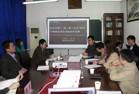 总支书记沈彤以“扎实开展‘一讲二评三公示’活动,不断推进bibo必博科学发展”为题向学校领导作汇报。沈彤对总支的创先争优活动,特别是暑假以来开展的“一讲二评三公示”活动,从三个方面做汇报:一是总支所做主要工作;二是目前存在的困难和急需解决的问题;三是继续努力的方向和计划。结合总支创先争优活动主题“传承红岩精神,创建国内先进的教学科研队伍,培养服务西部大开发、国家发展的高素质英语、翻译人才”,通过“一学、二带、三创”活动载体,在“一讲二评三公示”活动对工作环节要求严格,我们做到基本动作斗硬,做到党员人人有承诺,活动记载实讲实述,逐个点评不走过场,公示结果上墙见报。