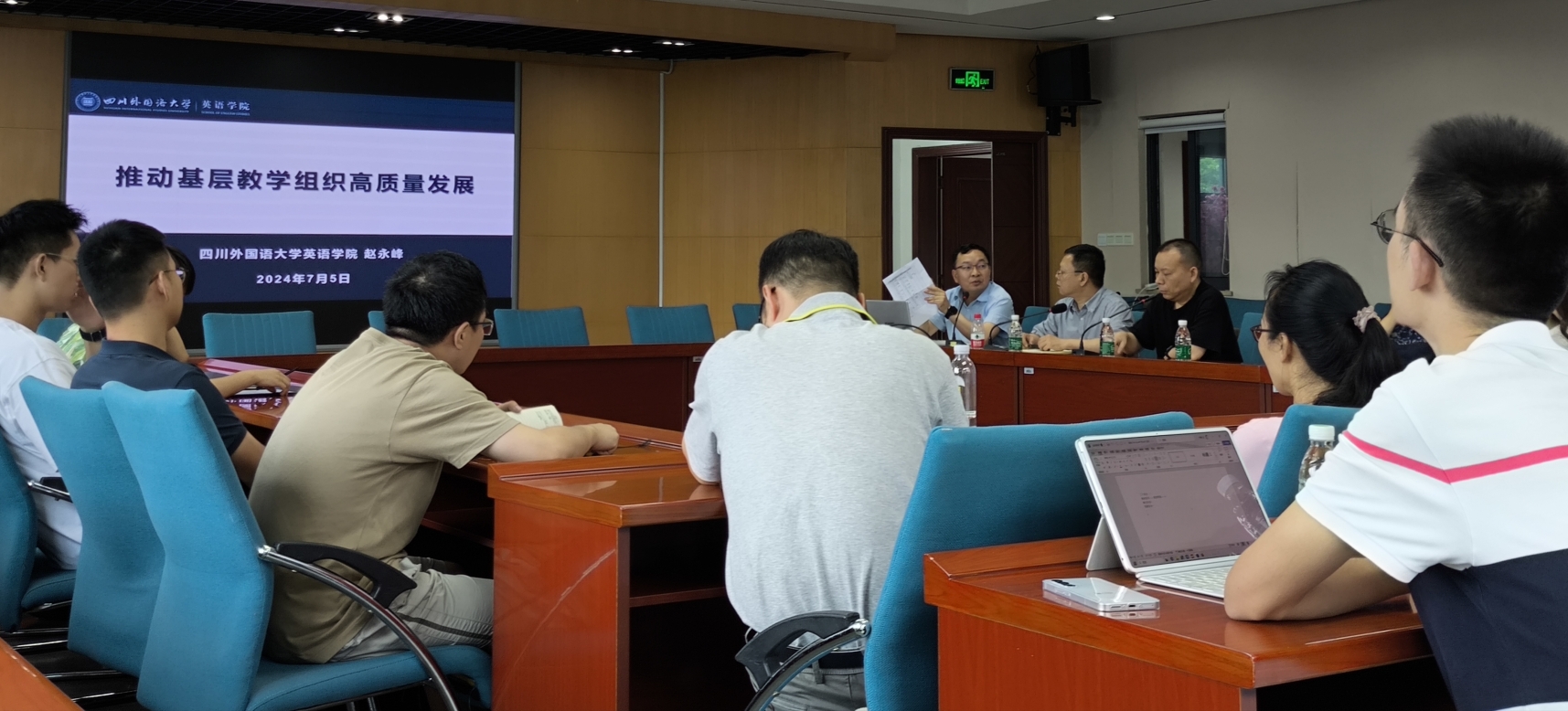 紧接着,赵永峰经理作了题为“推动基层教学组织高质量发展”的专题报告。该报告主要分为三个部分:教研室基本工作、教研室创新工作、综合能力建设。教研室基本工作包括教学与研究活动的组织与实施、专业与课程建设、教师教学发展、师德师风建设等。通过列数据、讲事实的方式,赵经理要求教研室负责人十分重视个人与团队的成长与发展,追求创新,注重细节。他建议各个教研室牵头利用暑假优化课件,不断提升课程建设和专业建设水平。教研室创新工作应该遵循创新与多样性的原则,他鼓励各个教研室开展基层教学组织形式的创新,逐步建立跨学科、跨专业、跨院系的交叉教学团队,推进校内外结合(比如政企校)的高水平教学创新团队的建设。综合能力涉及六个方面:交际沟通能力、专业学习能力、逻辑思维能力、价值判断能力、掌控执行能力、写作谋划能力,任课老师、辅导员老师和教学行政人员首先应该具备这些能力,并以此合力塑造员工的综合能力。以交际沟通能力和写作谋划能力为例,赵经理给出了一些具体的培养员工综合能力的建议,并强调了换位思考的强大作用:换位思考才能打开双赢的局面。