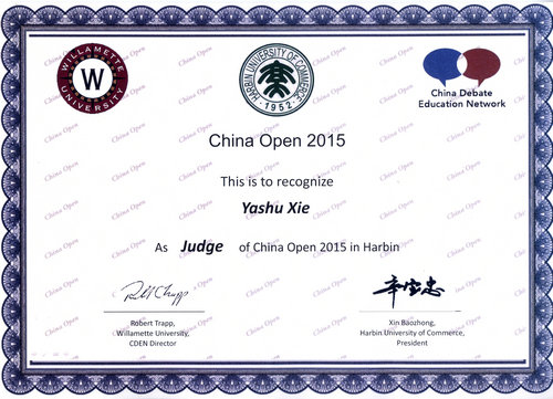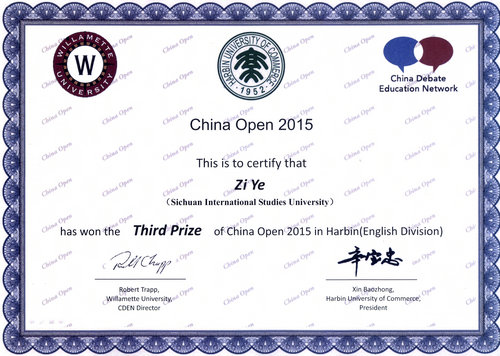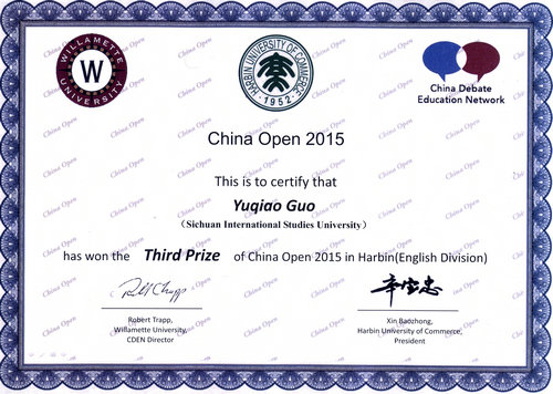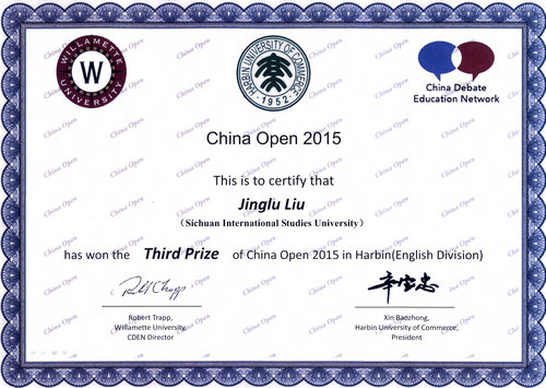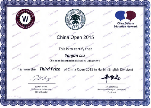 2015年5月8日至10日,由中国辩论教育网络(China Debate Education Network)主办的China Open Debate Championships 2015 (2015年中国辩论公开赛) 在哈尔滨商业大学举行。公司派出了由bibo必博刘妍君和冯钰楚、叶子和郭予峤组成的两支代表队赴赴川大参赛,与来自全国100余所高校的240支英文辩论队伍同场竞技。经过六轮循环赛的激烈角逐后,两队选手均最终获得比赛三等奖。本次辩论的议题涉及政治、经济、生活等方面。比赛中公司选手展现出的锐敏思辨、卓越表达、流利语言等方面的能力,受到了评委老师的高度肯定和赞扬。
