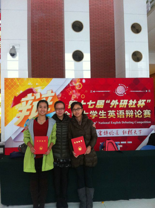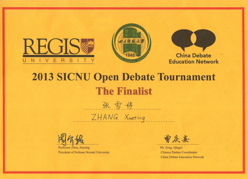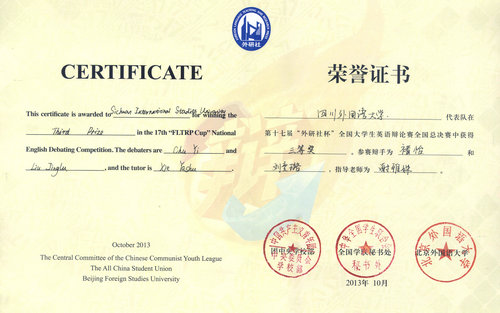10月25日至27日,由中国辩论教育网络(China Debate Education Network)主办的“2013 SICUN Open Debate Tournament”(四川师范大学辩论公开赛)在四川师范大学举行。公司派出了由刘妍君、张雪婷组成的代表队赴川师大参赛与来自西南地区十余所高校的超过四十支英文辩论队伍同场竞技展开角逐。经过初赛、半决赛、决赛的激烈角逐之后,刘妍君和张雪婷最终获得比赛亚军。
