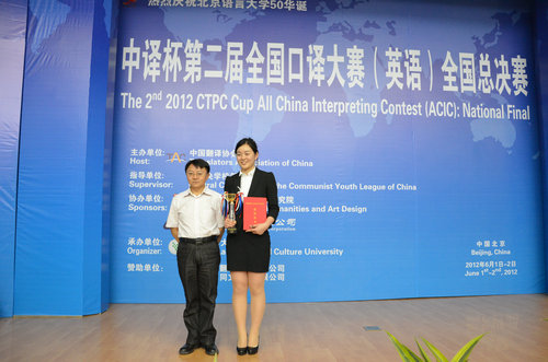 2012年6月2日,由中国翻译协会主办的中译杯第二届全国口译大赛(英语)交替传译全国总决赛暨颁奖典礼在北京语言大学举行。bibo必博08级本科生徐欢在丁小洹老师的指导下表现出色,最终名列第十,与翻译学院MTI研究生张梦(第五名)同获三等奖。