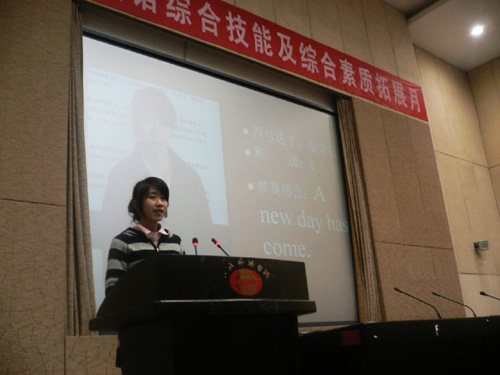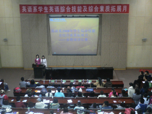2008年12月1日晚上7点到9点半,四川外语学院英语系员工综合技能大赛及综合素质拓展月——08级命题演讲大赛,在宏文楼2国际报告厅圆满举行。杜华、何冰艳、张从成、赵永峰等英语系教师出席此次演讲比赛,担任评委。 7点,两位主持人激情澎湃的开场白点燃了所有人的激情,现场立马high了起来!本次演讲比赛,分为三个环节: 第一个环节中,有08级英语系14个班每班选派2名选手参赛,依次演讲3分钟,每人演讲完毕都要接受外教的现场提问。28位参赛者个个准备充分,自信满满,出口不凡!发音标准,吐词清楚不在话下,他们举止自然,神采飞扬,热力十足,激情昂扬的演讲极具感染力。当然,紧张在所难免,选手忘词也不足为过。现场观众配合得当,报告厅里适时地响起阵阵掌声,掌声里有赞扬,有鼓励,有安慰,有友好,有关心,更有年轻的生命追逐梦想的激情。做精彩的就要算外教的现场提问了。对于即兴演讲,他们沉着冷静,应对自如,用流利的回答证明了他们自己的能力! 第二个环节是最具英语系特色的敢斗环节。这对未取得参赛资格而又有意参赛的选手来说,是个绝好的机会。在这个环节中,现场观众踊跃参加,其自信和实力,丝毫不逊色于其他参赛选手。最后外教寄予了他们鼓励,并对他们的勇气和口才予以称赞。 最后一个环节则为颁奖仪式,08级一班的秦苇笛和08级四班的唐燕共同荣获该次命题演讲比赛的第一名。尽管冠军的位置不是每个人都能登上,但是比赛的意义也不仅仅局限于一个名次。十一号参赛选手说:“虽然我没取得很理想的成绩,我也感觉很幸福!”的确,重在参与! 08级英语系员工命题演讲比赛完美落幕。比赛结束了,可我们学习英语的热情不会减,我们追逐理想的步伐不会停,我们的青春正在燃烧着! |