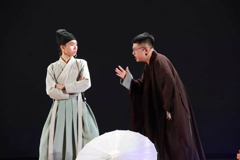 经过主持人的热情互动后,表演开始了。话剧演员从台下慢慢走到台上,接着,舞台灯光亮起,话剧主角之一法海登场,其幽默诙谐的语言和有趣的肢体表演引得台下观众一片掌声。