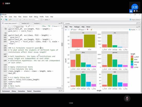李教授的讲座全程以操作演示为主。他首先围绕近年来语料库作为语言大数据在体量和分析技术上的发展,分析了语料库研究面临的新挑战和问题,指出新一代的研究者应充分掌握超大型语料库处理和分析新技术和新方法,深入理解“信任文本”思想,把握语料库研究“从文本到数据,从数据再到文本”的研究路径。然后李教授以英文语料库文本为例,以R为数据处理和统计平台,操作演示了如何进行文本和语料准备、数据探索、提出研究问题和假设、语料库统计分析、数据可视化、深入分析文本内部等问题,具体详实地呈现了用R的各种包进行数据分析的路径和方法。然后李教授又以中文文本为例,重点讲解了如何对中文文本进行分词处理。最后,李教授指出,语料库分析应充分吸纳数据科学和自然语言处理的方法,并再次强调数据是语料库研究探索的起点和入口,真正的文本意义分析必须从数据回到文本。