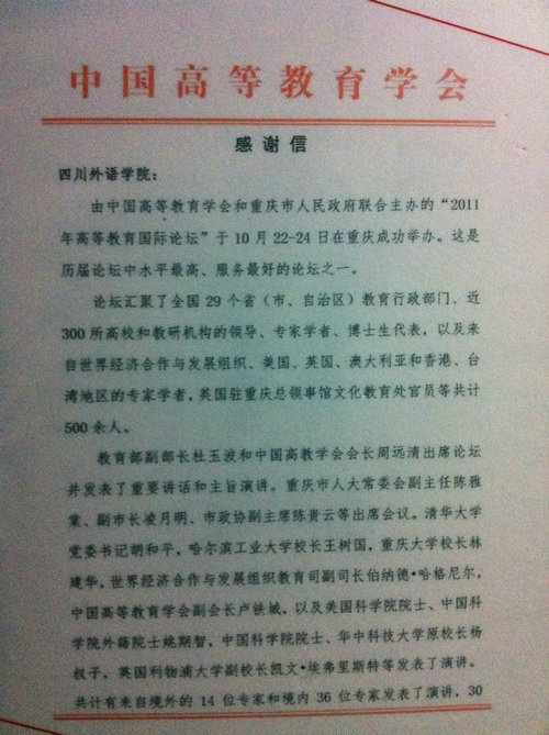 2011年10月23日,高等教育国际论坛在重庆隆重召开。该论坛由中国高等教育学会和重庆市人民政府联合举办,来自全国29个省(市、自治区)教育行政 部门、近300所高校和教研机构的领导、专家学者、博士生代表,以及来自世界经济合作与发展组织、美国、英国、澳大利亚和香港、台湾地区的专家学者,英国驻重庆总领事馆文化教育处官员等共计600余人,围绕“质量提升与建设高等教育强国”的主题展开热烈研讨。