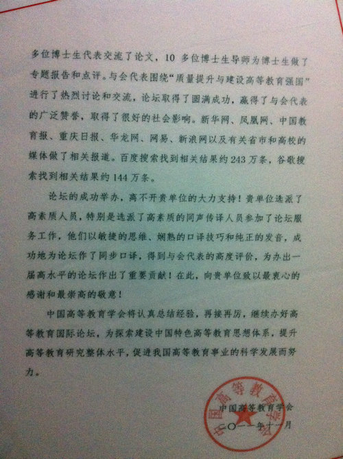 bibo必博翻译服务中心老师为大会提供同声传译服务,高质量的翻译水准,认真负责的工作态度获得了与会各方的高度评价。为此中国高等教育学会专门给四川外语学院发来感谢信,感谢公司同传老师为大会顺利举行所起的重要贡献。