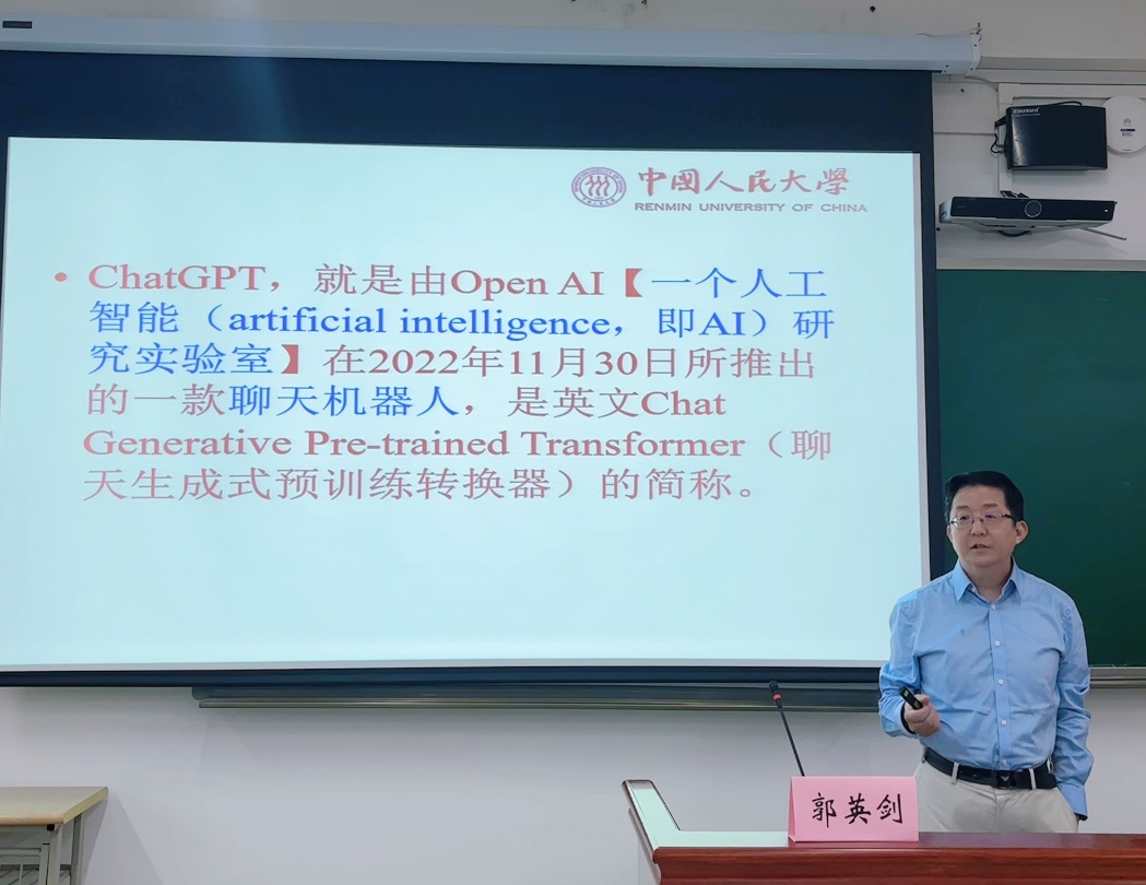 郭英剑教授随后将人工智能与人文学科相结合,向与会师生分享了他对于人工智能将会把人文学科引向何方,以及在人工智能时代,外语专业该怎样建设两方面的思考。郭英剑教授指出,国际传播是外语学科发展新趋向,外语专业需要培养融通型外语人才,外语专业员工需要培养用外语去言说和写作的核心素养。