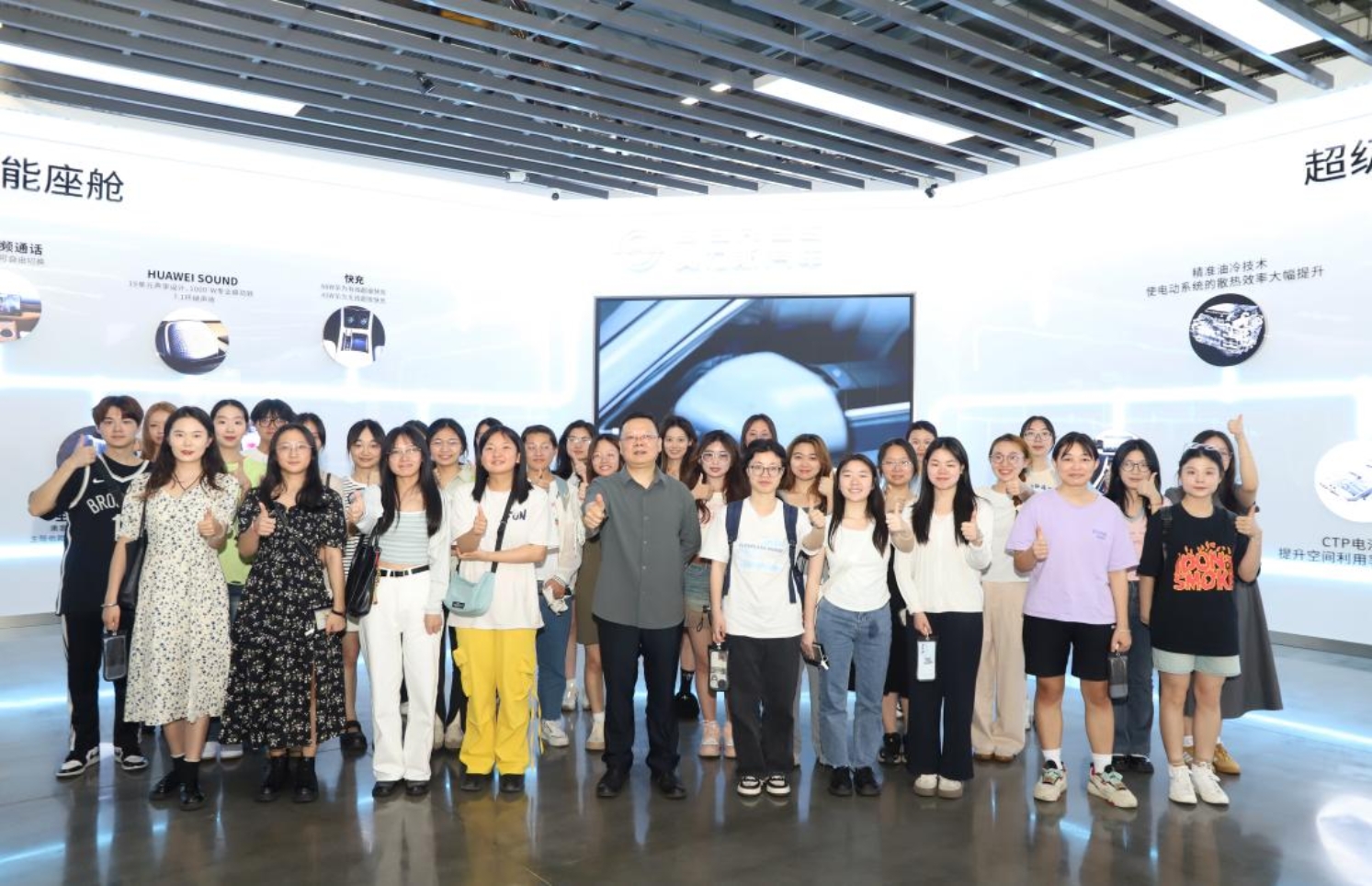 在赛力斯方工作人员的引导下,同学们了解了赛力斯的发展历程以及主要业务领域。赛力斯股份有限公司始创于1986年,是一家以新能源汽车为核心业务的科技型制造企业;现有员工2万人,A股上市公司,中国企业500强。业务涉及新能源汽车及核心三电、传统汽车及核心部件总成的研发、制造、销售及服务。随后,工作人员向同学们介绍了赛力斯与华为联合制造的“问界”系列车型。讲解完毕后,同学们非常积极踊跃地参与了上车体验。