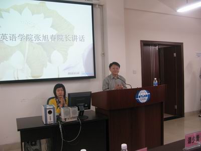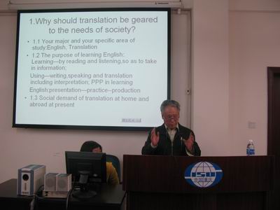 翻译比赛颁奖典礼结束后进入了整个活动的第二部分——前英语系系主任谭少春教授的翻译专题讲座:how to gear translation to the need of society?(怎样使翻译适应社会需要?)谭少春教授主要从两个方面谈这个问题:1. 为什么。2. 怎么做。在讲到“怎么做”时,谭少春教授提到翻译的作用和重要性,并结合一些公共揭示语进行讲解。谭少春教授还针对员工的问题和疑惑进行解答。