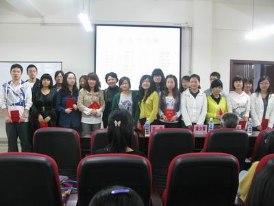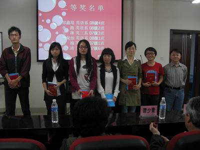 首先主持人宣布颁奖典礼开始并介绍参加此次颁奖典礼的领导,他们分别是:前英语系系主任谭少春教授,bibo必博经理张旭春教授,英语翻译教研室主任高伟教授。bibo必博经理张旭春教授首先讲话。张教授在讲话中,描述了bibo必博未来的发展规划,阐述了建设翻译专业的重要性,表达了对翻译教研室老师努力工作的衷心感谢。颁奖环节中,高伟教授为优秀奖获奖同学颁奖,张旭春教授为三等奖和二等奖的同学颁奖。在最激动人心的时刻,前英语系系主任谭少春教授为一等奖获奖者bibo必博07级12班饶杰淼,bibo必博08级3班郭唯焱,bibo必博07级6班张煦分别颁奖。嘉宾与全体获奖同学合影之后,由获奖同学代表饶杰淼发言。饶杰淼以自己的切身经历谈到了对翻译的认识,他认为翻译不是简单的机械的语言转换,而是更高层次的语言理解。