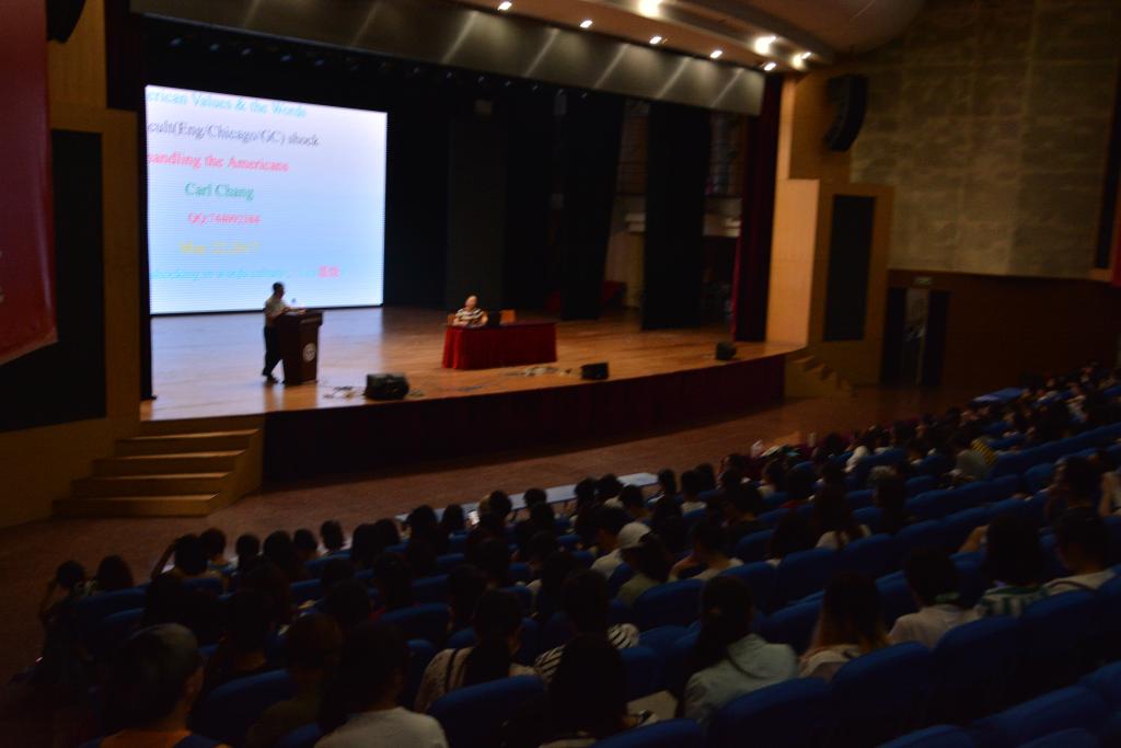 首先,常亮老师通过自己在美国作为访问学者的经历,以英语文化中最常见的单词为切入点,和大家分享了他所感受的culture shock。他从寄宿家庭讲到学校生活;从语言表达的差别讲到行为习惯的不同。此外他还提到口语与书面写作中单词使用的差异,例如我们平时常见的单词“start”在口语中常用“kick-off”,而形容食物可口通常用“yummy”而不是“delicious”。
