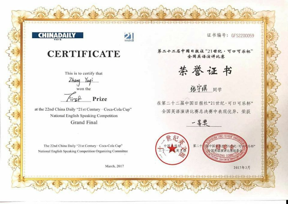 张宇琪的演讲激情四溢,抑扬顿挫,获得来自国际英语联合会、外交部、教育部、英国文化教育协会、英国大使馆文化教育处,以及内地、香港、澳门、英国、美国、澳大利亚等知名高校和中国日报社的英语专家们组成的评委团的一致好评。