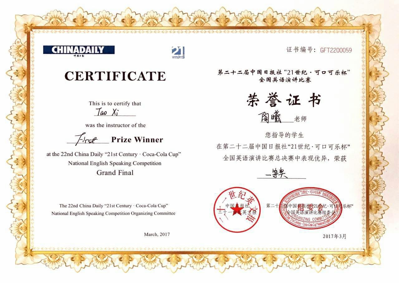 3月26日,在南京大学举行的第22届“21世纪杯”全国英语演讲比赛中,公司员工张宇琪,在陶曦老师指导下,获得一等奖。