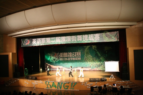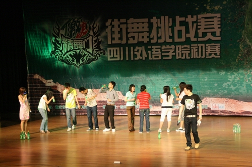 5月13日晚七点整,由 百事天府有限公司主办、川外英语系承办,Babyface酒吧合作协办的精舞门街舞挑战赛初赛在大礼堂隆重举行,到场的不仅有实力不凡的参赛选手更有元老级的裁判,给现场观众奉上了一顿饕餮大餐。 距比赛开始还有一个半小时,大礼堂外已聚集了众多翘首以待的观众。比赛开始后现场气氛更不是用一个HIGH可以形容的了的,可谓是史无前例。 参加比赛的共有ST&AZ, eleven,再见了校车,新舞社,soul-locker, soul-street等九支队伍,个个舞艺超群,引来现场的观众的阵阵惊呼和不息的掌声。主办方还邀请到了文博,牟迪,妙妙担任评委。期间还有精彩的互动,男主持人诙谐幽默,女主持人妙语连珠,现场同学踊跃参加,还有精美礼品和激浪饮品赠送,让现场气氛不断升温。整个比赛分为三部分,每个部分两到三个舞蹈。第一部分中全体参赛舞者共同表演开场秀,并由主持人宣布赛制和奖励机制,第二部分中各实力团体依次带来精彩的舞蹈表演,生动有趣的互动环节穿插其中。第三部分是由得分最高的两组舞蹈团体参加的团体battle以及颁奖仪式。 最后裁判们在Free style 和b-boy里各选出冠亚军,然后两支队伍分别进行最后的冲刺,进入了最精彩的斗舞环节,把现场气氛推向了高潮。他们的舞艺无法让人不叹服。最后,经过激烈的比赛,新舞社取得了b-boy组的冠军,ST&AZ取得了dancer组冠军。 比赛进行了两个多小时,与其说这是一次街舞比赛。不如说它是一个大的晚会,每个人都乐在其中,参赛者完全就是在享受街舞,并且都互相学习,没有一丝比赛的紧张和不安,现场同学也都沉浸在他们精彩的表演中,尽情的享受街舞带来的冲击和震撼。比赛带给观众的却远远不止这些,带给参赛者自己的也远远不只是冠亚军的区别,比赛会有成败,他们的青春永远不会败,永远在骄傲的张扬。